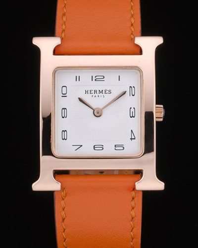 Hermes Heure H Rose Gold Diamond Encrusted Bezel Orange Leather Strap White Dial 80237