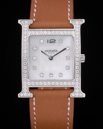 Hermes Heure H Stainless Steel Diamond Encrusted Bezel Tan Leather Strap White Dial 80232
