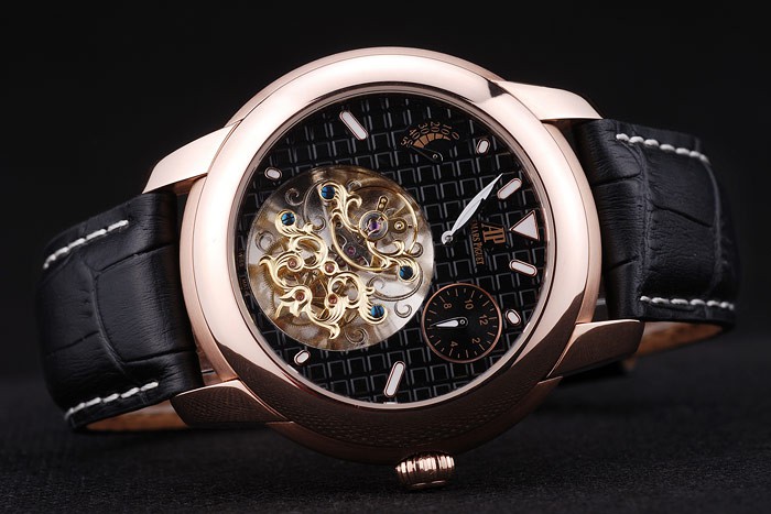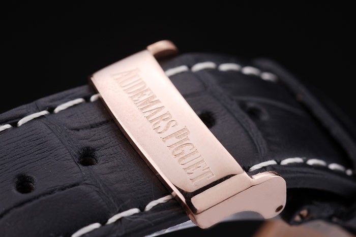 Bracelet: Heat embossed Audemars Piguet Replica black crocodile leather strap with Audemars Piguet Replica engraved stainless steel fold-in clasp