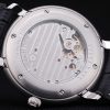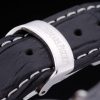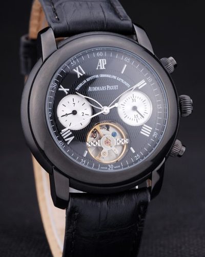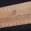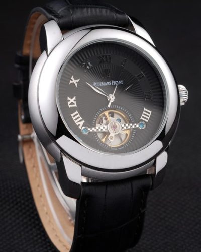 Bracelet: Black crocodile leather strap with white stitching and heat embossed Audemars Piguet Replica name and logo and an Audemars Piguet Replica inscribed stainless steel flip-over hook clasp