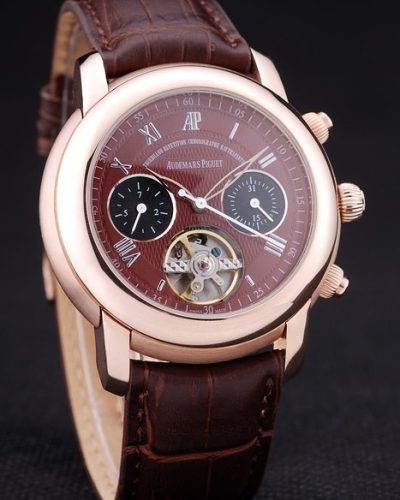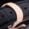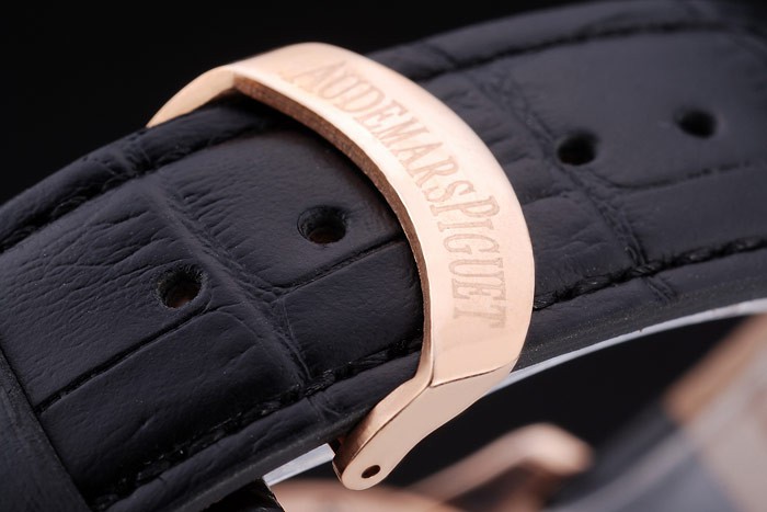 Bracelet: Black crocodile leather strap with heat embossed Audemars Piguet Replica name and logo and an Audemars Piguet Replica inscribed 18k rose-gold plated flip-over hook clasp