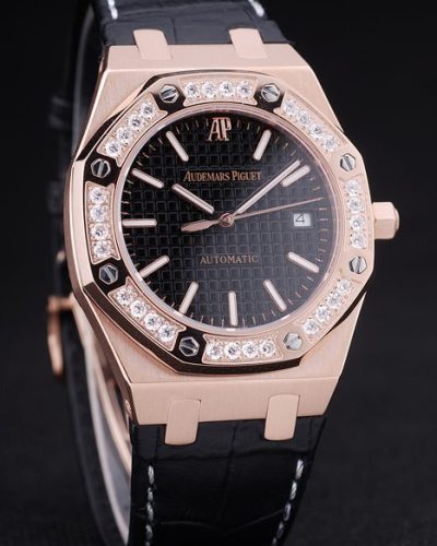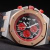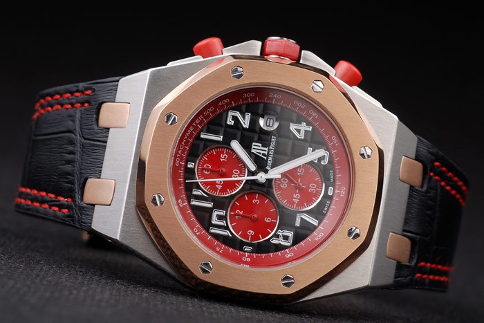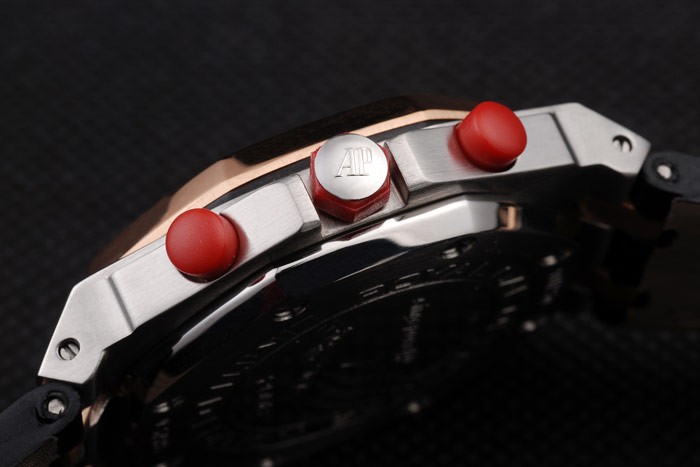 Back: Brushed stainless steel screwed down back with Audemars Piguet Replica logo and engravings Gender: UominiMovement: Quarzo (Batteria) Quality: Giapponese Miyota Color: Nero Case: Rose-gold plated case Bracelet: Heat embossed Audemars Piguet Replica black crocodile leather strap and Audemars Piguet Replica engraved rose-gold plated fold-in clasp Bracelet Length: 220 x 25 mm Bezel: Rose-gold plated bezel screwed down by stainless steel screws Band Type: Pelle Diameter: 48 x 40 mm Chronograph: Si Watch Clasp: Flip Clasp Glass: Sapphire Crystal Crown: Red rubber hexagonal crown with the initials AP on stainless steel stud plus a red round rubber crown on either side of it Case Thickness: 16 mm