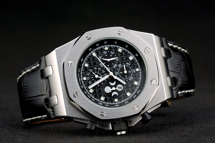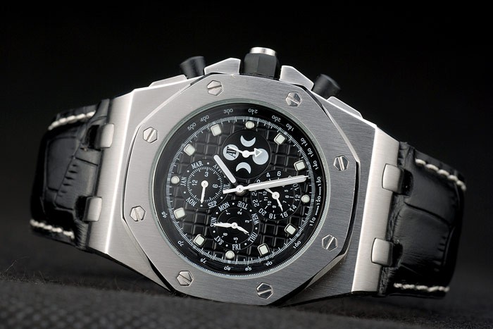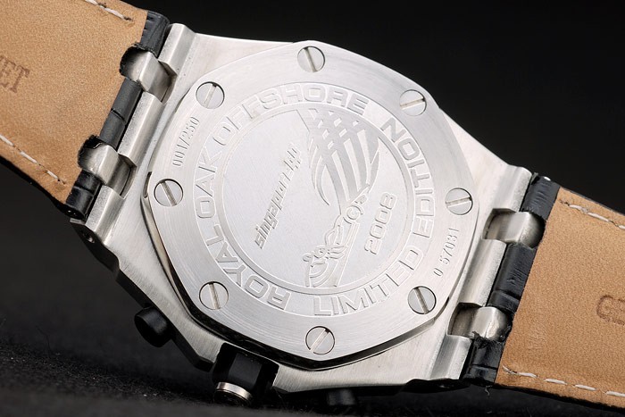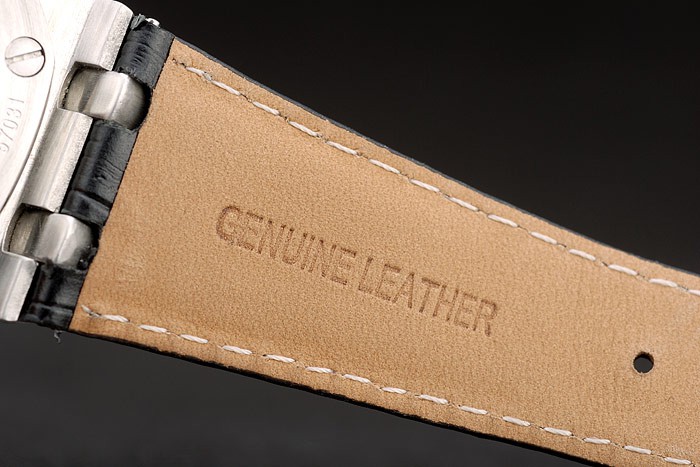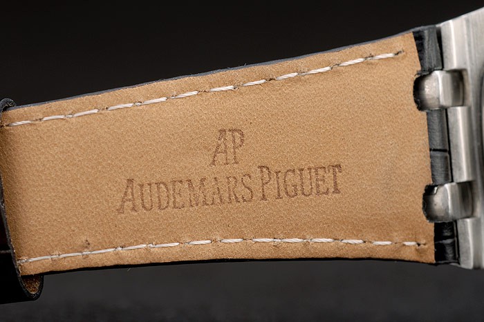 Bracelet: Audemars Piguet Replica heat embossed black crocodile leather strap with Audemars Piguet Replica engraved polished stainless steel hidden hook clasp