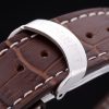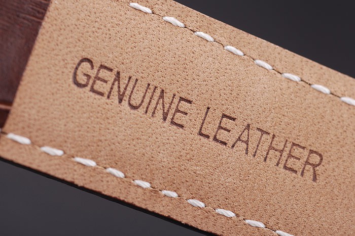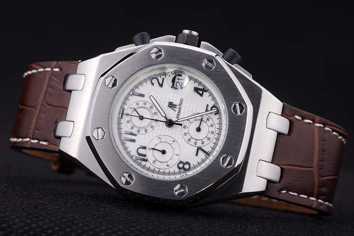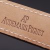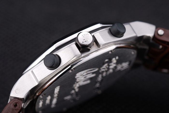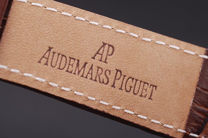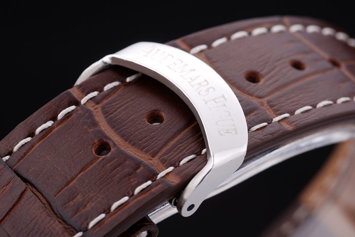 Bracelet: Dark brown crocodile leather strap with white thread stitching and heat embossed Audemars Piguet Replica name and logo and an Audemars Piguet Replica inscribed stainless steel flip-over hook clasp