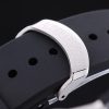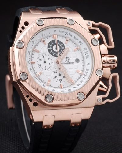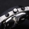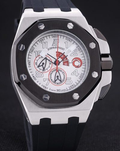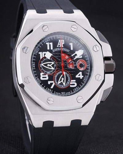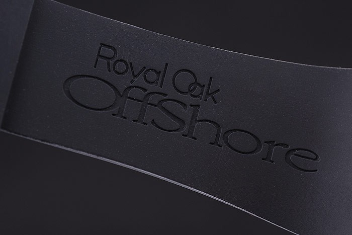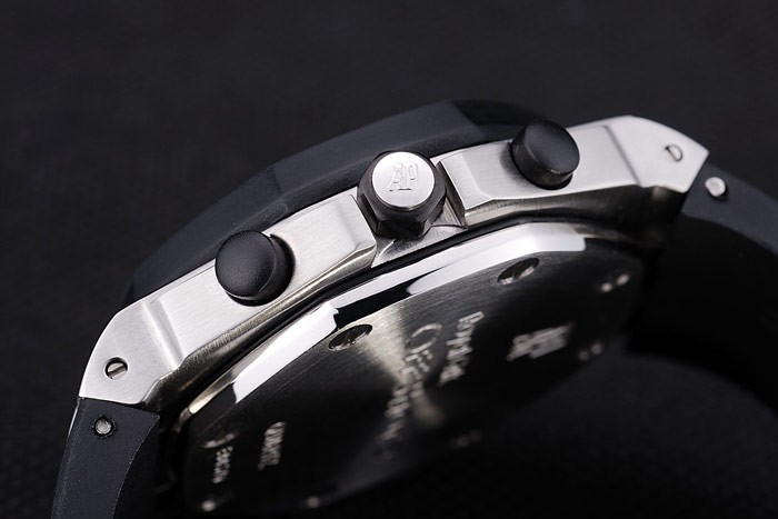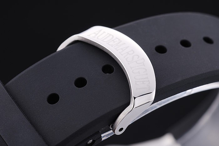 Bracelet: Black rubber strap with heat embossed Audemars Piguet Replica Royal Oak Offshore stamp and an Audemars Piguet Replica inscribed stainless steel flip-over hook clasp