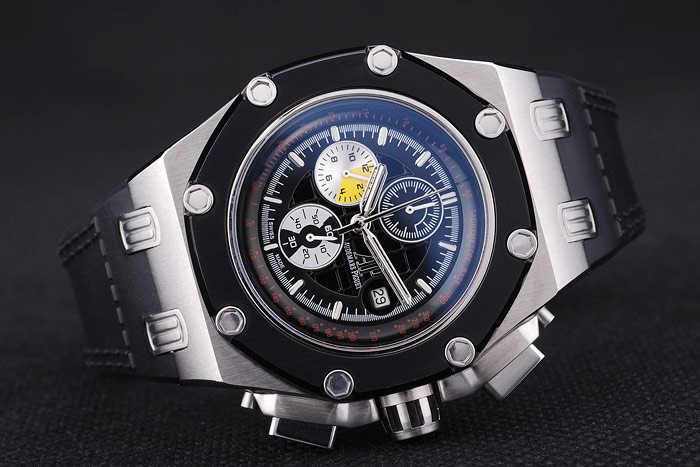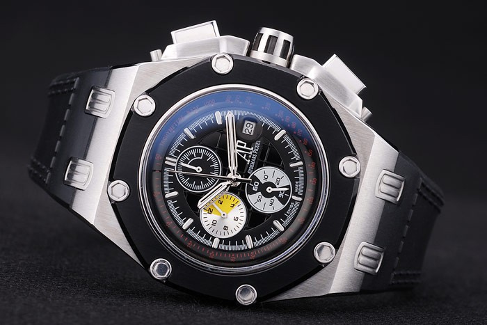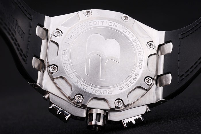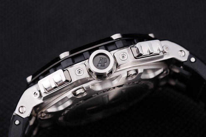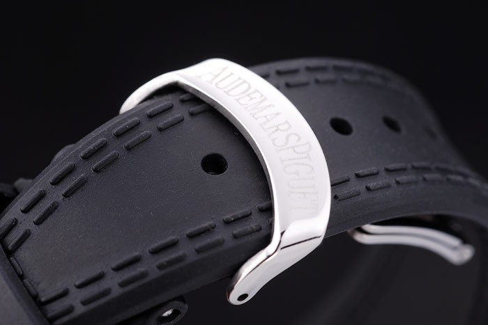 Bracelet: Heat embossed Audemars Piguet Replica Swiss Made and logo black rubber strap with Audemars Piguet Replica engraved stainless steel hook-buckle clasp