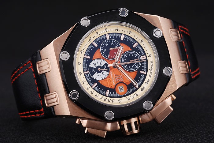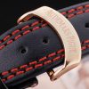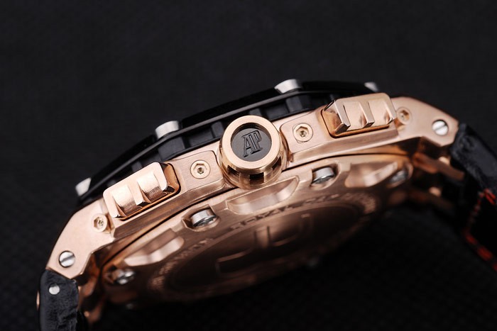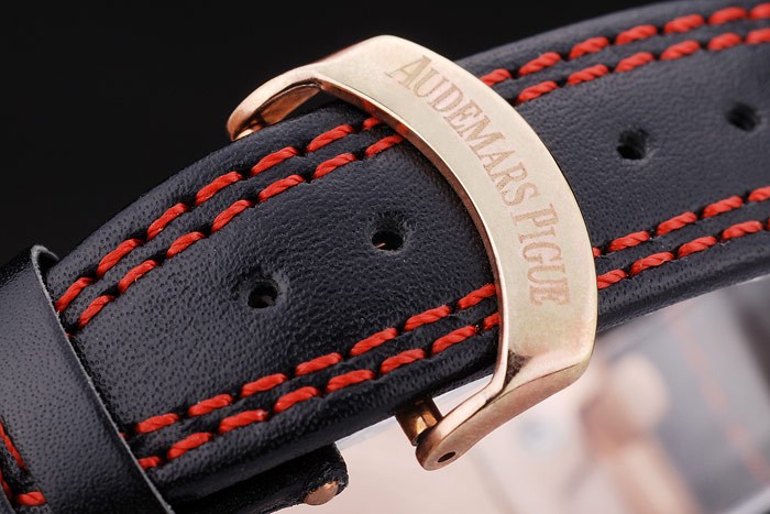 Bracelet: Heat embossed Audemars Piguet Replica Swiss Made and logo black leather strap with double red thread stitching and Audemars Piguet Replica engraved rose-gold plated hook-buckle clasp