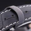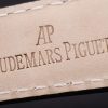 Bracelet: Black crocodile leather strap with white thread stitching and heat embossed Audemars Piguet Replica name and logo and an Audemars Piguet Replica inscribed ion-plated flip-over hook clasp
