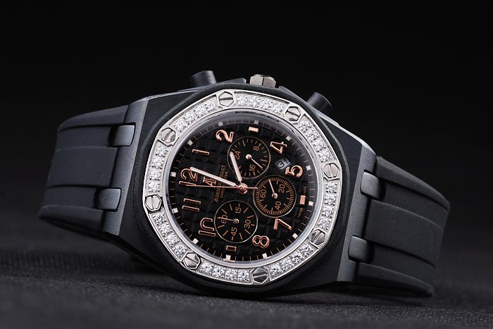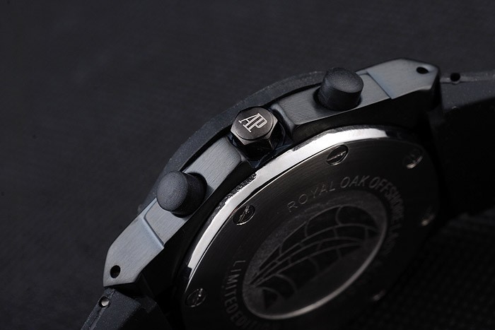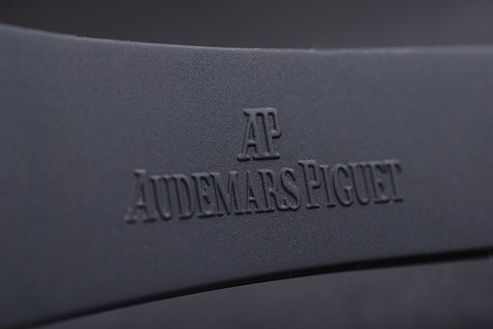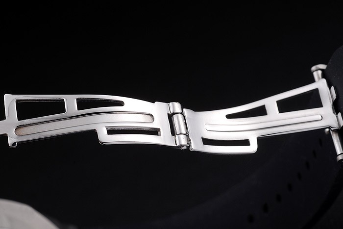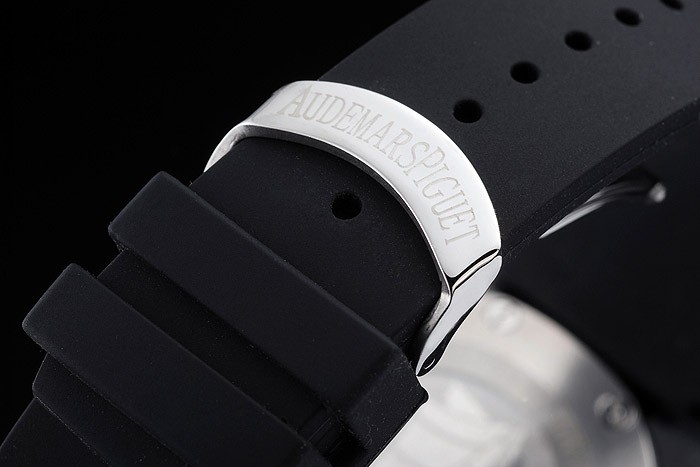 Bracelet: Audemars Piguet Replica embossed black rubber strap with Audemars Piguet Replica engraved stainless steel fold-in clasp