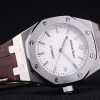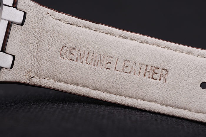 Bracelet: Brown crocodile leather strap with white thread stitching and heat embossed Audemars Piguet Replica name and logo and an Audemars Piguet Replica inscribed stainless steel flip-over hook clasp