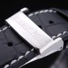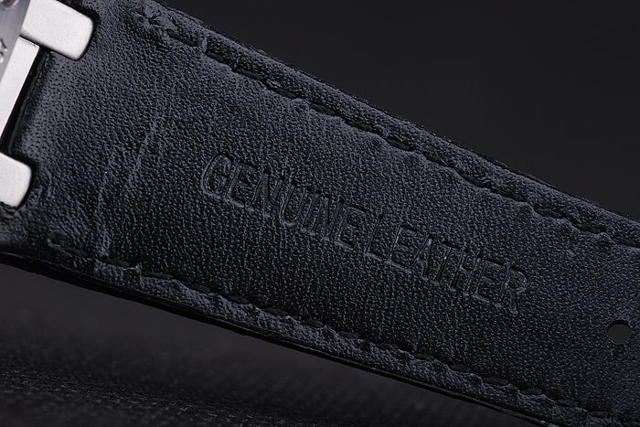 Bracelet: Black crocodile leather strap with white thread stitching and heat embossed Audemars Piguet Replica name and logo and an Audemars Piguet Replica inscribed stainless steel flip-over hook clasp
