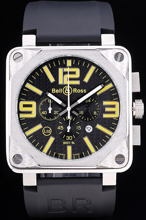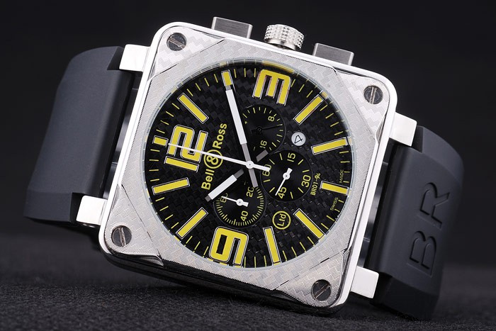 Bracelet: Heat embossed Bell & Ross Replica logo and product code black rubber strap with BR inscribed brushed stainless steel hook-buckle clasp