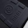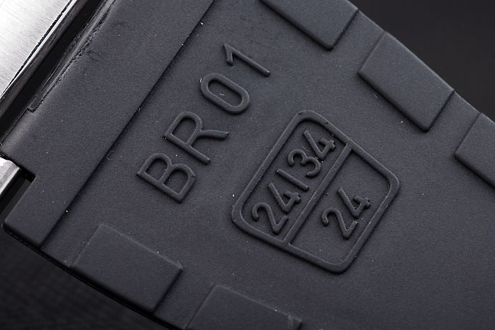 Bracelet: Black rubber strap with heat embossed logo, model number and product code and BR engraved brushed stainless steel hook-buckle clasp