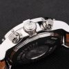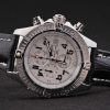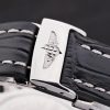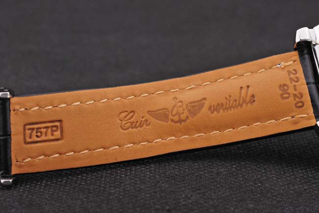Bracelet: Black high-grade leather in a crocodile pattern, with heavy white cotton stitching. Tan inner band is embossed with the Breitling Replica name and logo, and has a steel buckle closure.