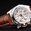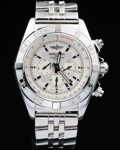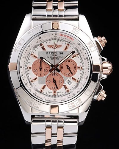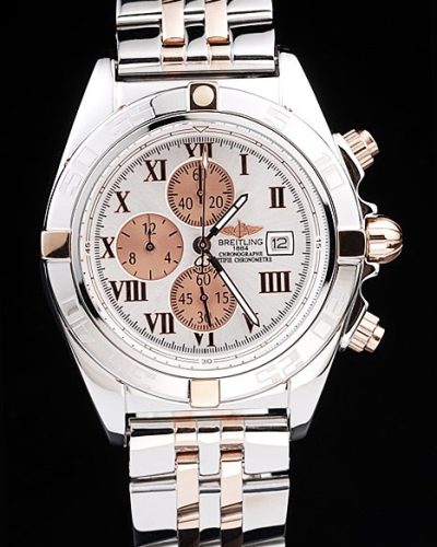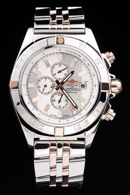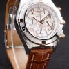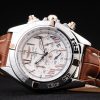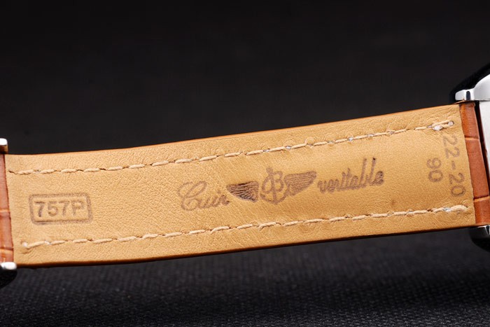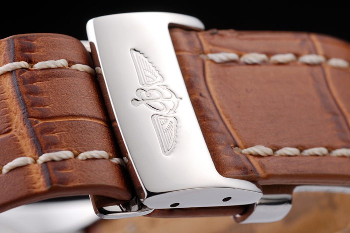 Bracelet: Brown crocodile leather strap with patent white stitching and heat embossed Breitling Replica engravings and engraved stainless steel fold in clasp with Breitling Replica logo on top