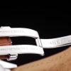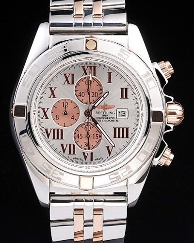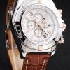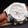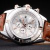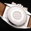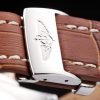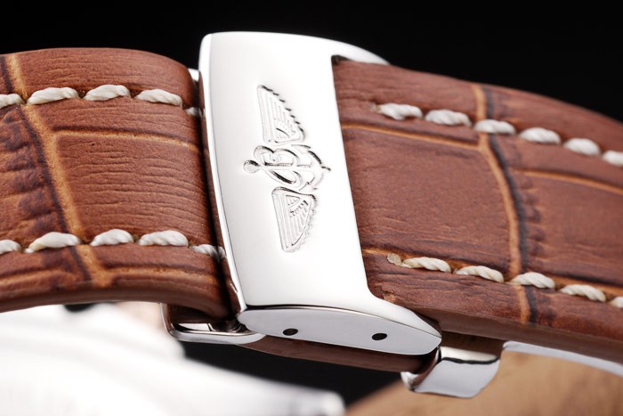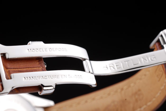 Bracelet: Brown crocodile leather strap with patent white stitching and heat embossed Breitling Replica engravings and engraved stainless steel fold in clasp with Breitling Replica logo on top