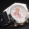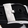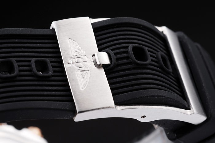 Bracelet: Ribbed black rubber strap with engraved stainless steel hook-buckle clasp with Breitling Replica logo on top