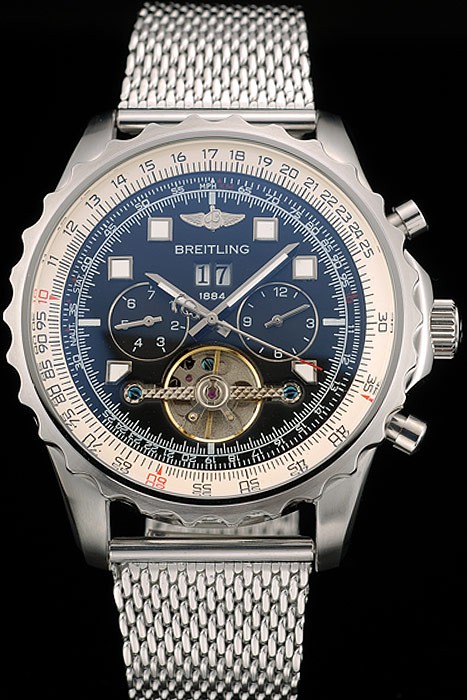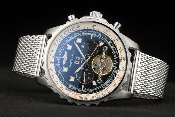 Crown: Polished stainless steel cutwork crown with Breitling Replica logo and two small round push-button crowns on either side of it