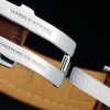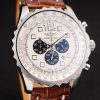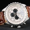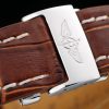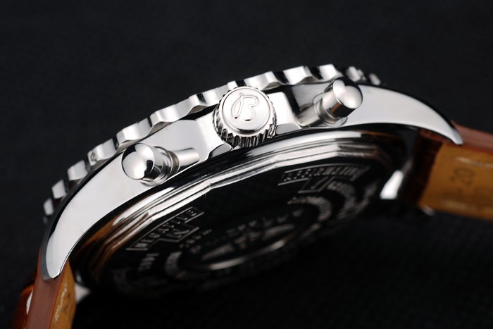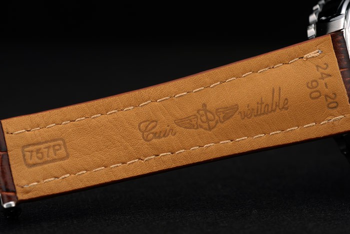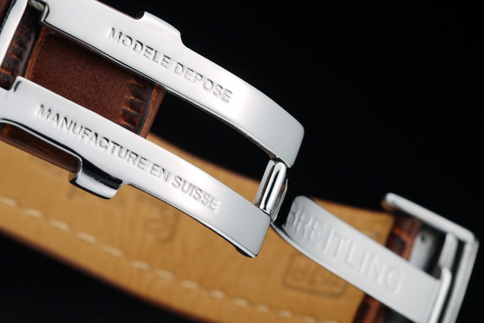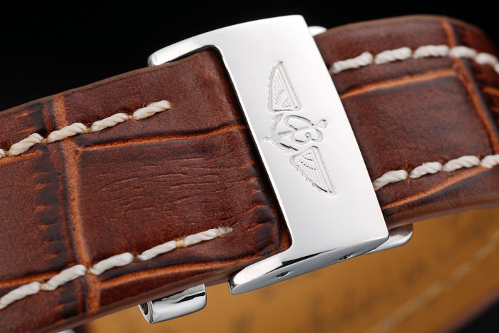 Bracelet: Heat embossed Breitling Replica name and logo brown crocodile leather strap with white thread stiching and logo engraved stainless steel fold-in clasp