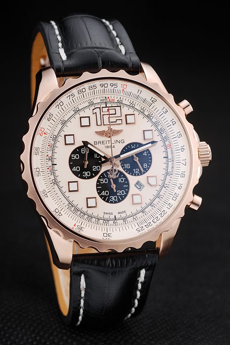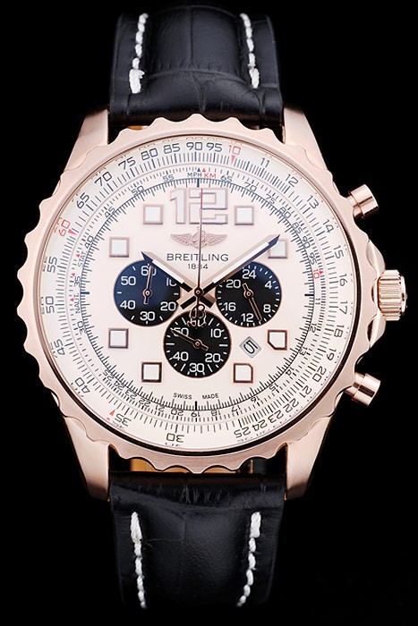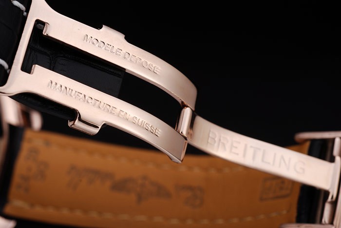 Bracelet: Heat embossed Breitling Replica name and logo black crocodile leather strap with white thread stiching and logo engraved rose-gold plated fold-in clasp