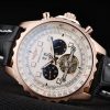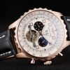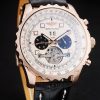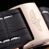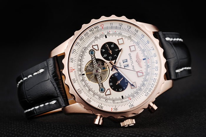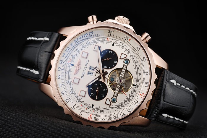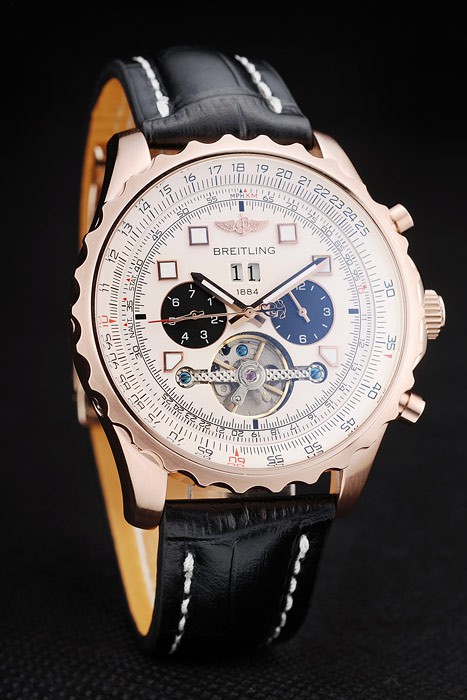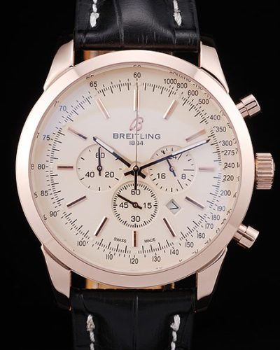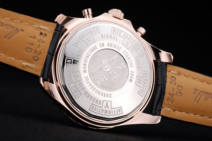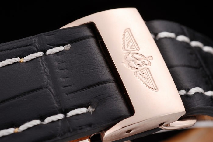 Bracelet: Heat embossed Breitling Replica name and logo black crocodile leather strap with white thread stiching and logo engraved rose-gold plated fold-in clasp