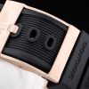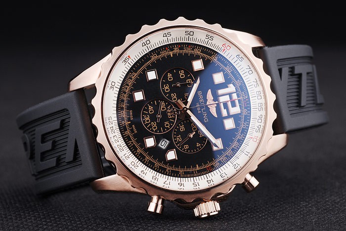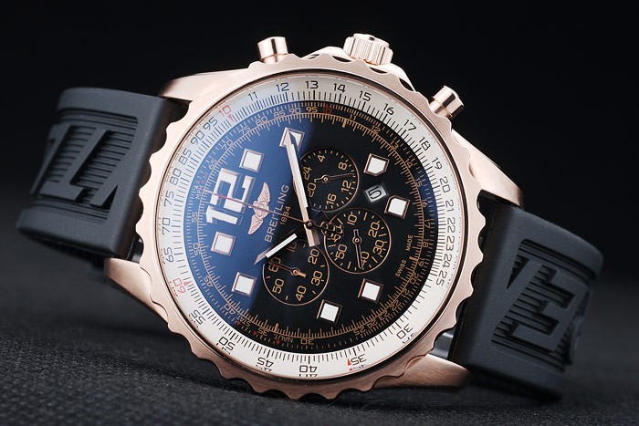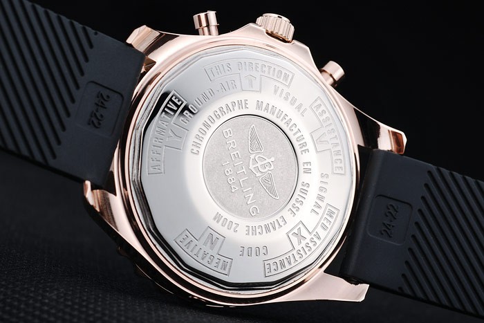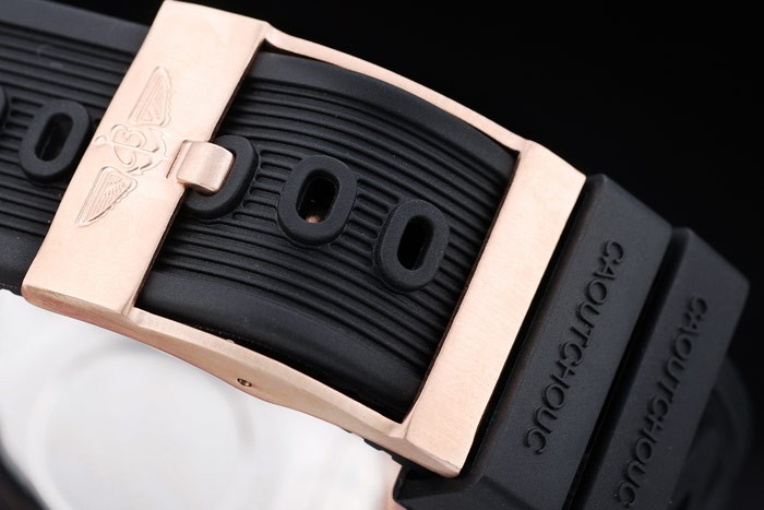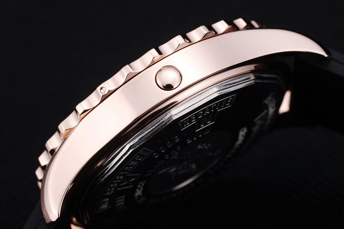 Bracelet: Black rubber strap with Breitling Replica logo engraved rose-gold plated hook-buckle clasp