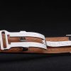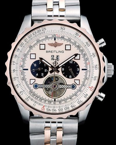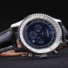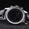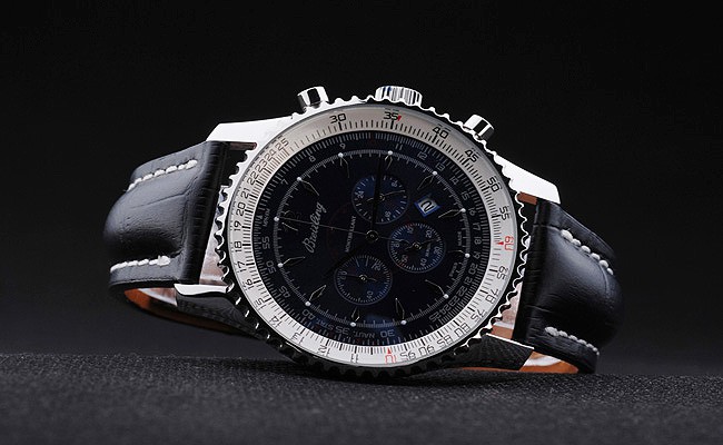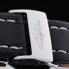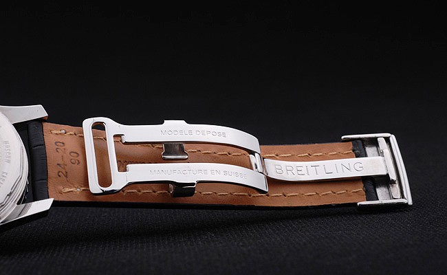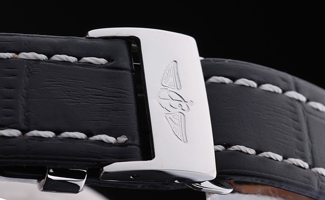 Bracelet: Black crocodile leather strap with patent white stitching and heat embossed Breitling Replica engravings and engraved stainless steel fold in clasp with Breitling Replica logo on top