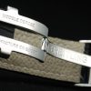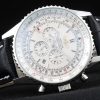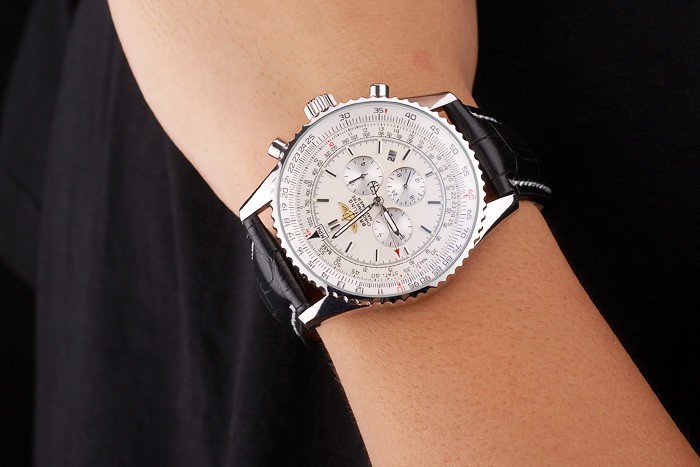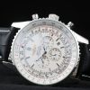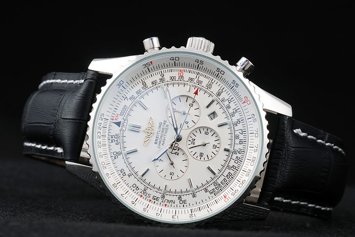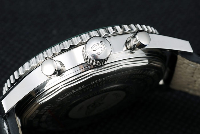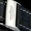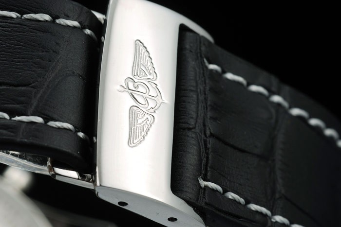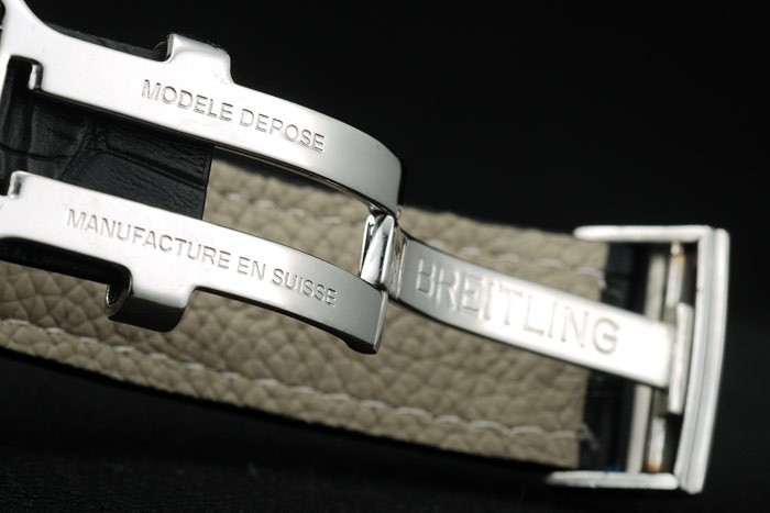Bracelet: Black crocodile leather strap with patent white stitching and heat embossed Breitling Replica engravings and engraved stainless steel fold in clasp with Breitling Replica logo on top