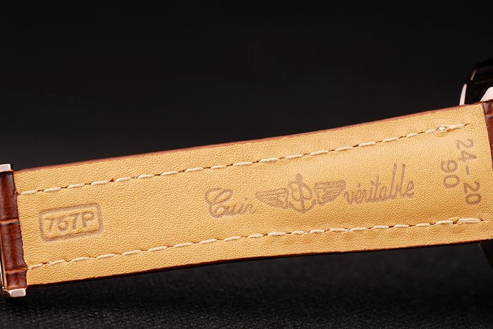 Back: Stainless steel snap-in back with Breitling Replica inscription Gender: UominiMovement: Quarzo (Batteria) Quality: Giapponese Miyota Color: Marrone Case: 18k rose-gold plated case Bracelet: Heat embossed Breitling Replica brown crocodile leather strap with white thread stitching and a Breitling Replica logo engraved fold-in rose-gold plated clasp Bracelet Length: 210 x 24 mm Bezel: 18k rose-gold plated bezel Band Type: Pelle di coccodrillo Diameter: 55 x 45 mm Watch Clasp: Flip Clasp Crown: Bell & Ross Replica logo engraved 18k rose-gold plated cutwork crown with two small round push-button crowns on either side of it Case Thickness: 15 mm