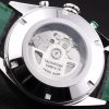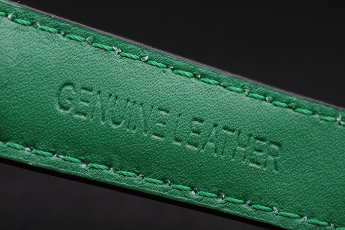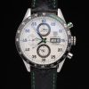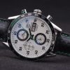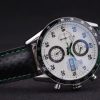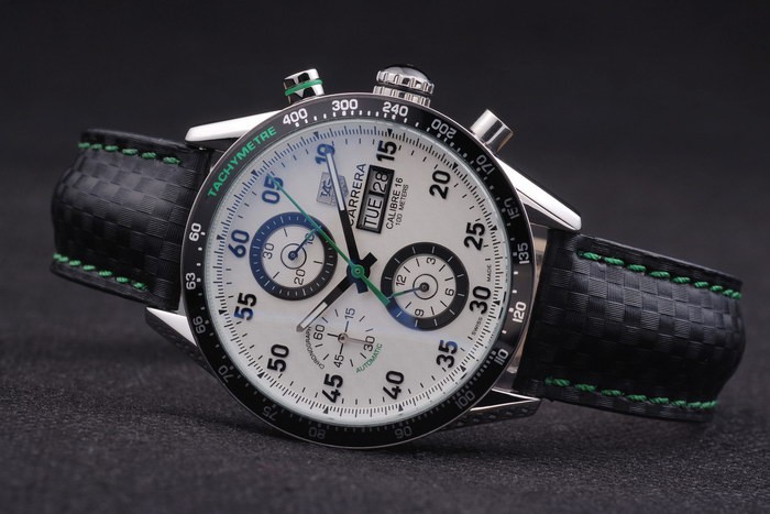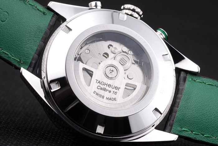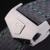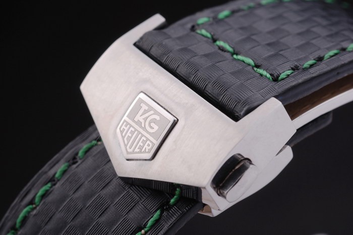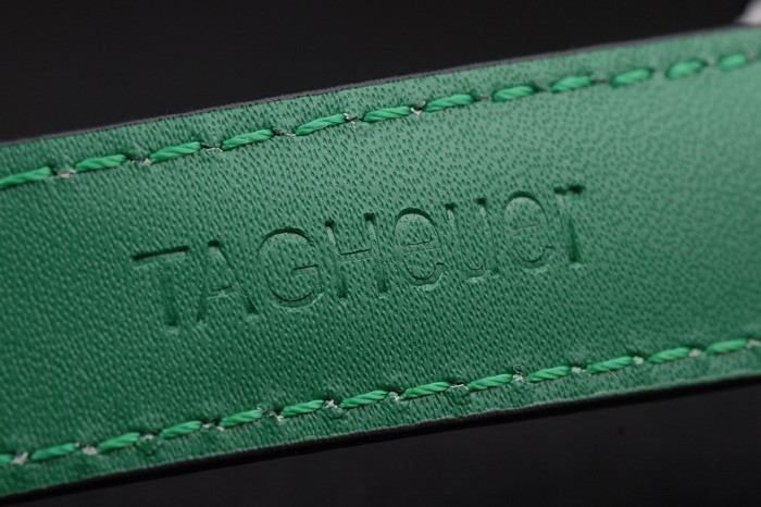 Bracelet: Black leather strap with green colored seams and a Tag Heuer Replica marking and brushed stainless steel deployment clasp