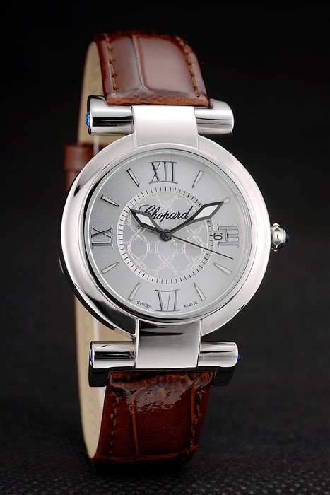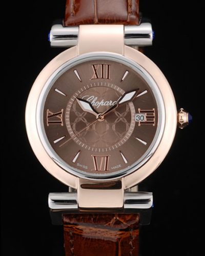 Bracelet: Brown crocodile leather strap with heat embossed Chopard Replica stamp and Chopard Replica engraved stainless steel hook-buckle clasp