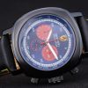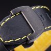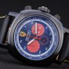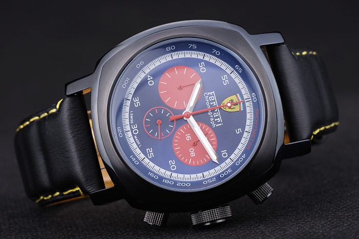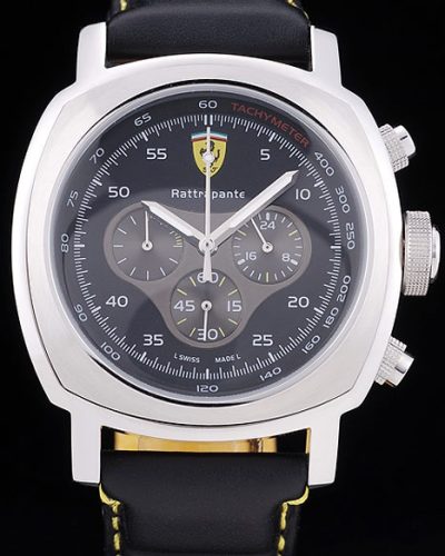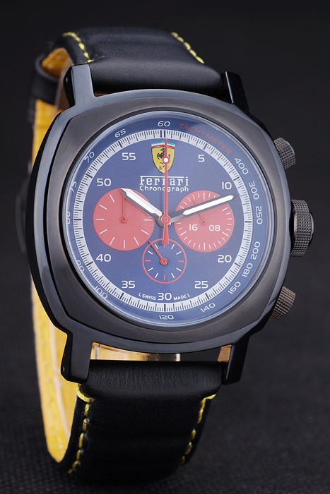 Back: Yellow and black rubberized Ferrari Replica logo centered stainless steel back with inscription Gender: UominiMovement: Quarzo (Batteria) Quality: Giapponese Miyota Color: Nero Case: Ion-plated stainless steel case Bracelet: Black leather strap with yellow thread stitching and Ferrari Replica engraved ion-plated fold-in hook clasp Bracelet Length: 190 x 24 mm Bezel: Ion-plated bezel Band Type: Pelle Diameter: 55 x 42 mm Watch Clasp: Butterfly Clasp Crown: Ion-plated Ferrari Replica logo engraved fine cutwork crown with two smaller cutwork push-button crowns on either side of it Case Thickness: 17 mm