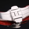 Bracelet: Black leather strap with red thread stitching and Ferrari Replica engraved stainless steel fold-in hook clasp