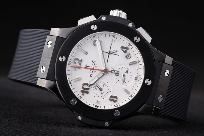 Bracelet: Textured black rubber band with ion-plated push-button hook clasp and Hublot Replica engravings