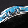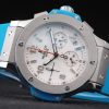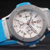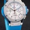 Bracelet: Textured blue rubber band with brushed stainless steel push-button hook clasp and Hublot Replica engravings