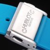 Crown: Cutwork brushed stainless steel crown with ‘H’ engraving and two rectangular push-button crowns on either side, all studded with blue rubber trimmings