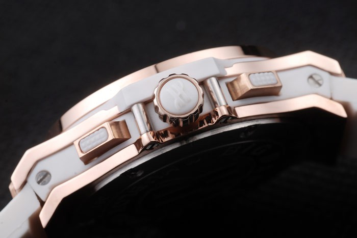 Bracelet: Textured white rubber band with rose-gold push-button hook clasp and Hublot Replica engravings