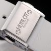 Crown: Cutwork brushed stainless steel crown with ‘H’ engraving and two rectangular push-button crowns on either side, all studded with white rubber trimmings