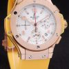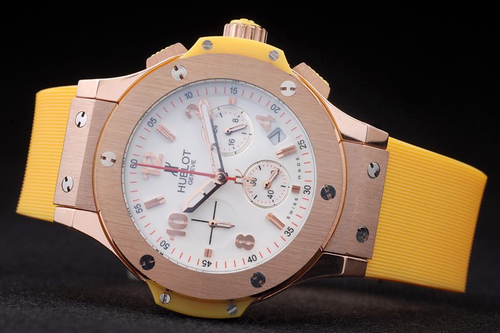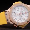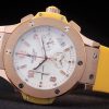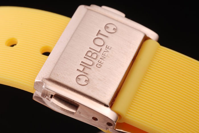Bracelet: Textured yellow rubber band with rose-gold push-button hook clasp and Hublot Replica engravings