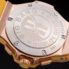 Crown: Cutwork rose-gold crown with ‘H’ engraving and two rectangular push-button crowns on either side, all studded with yellow rubber trimmings