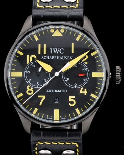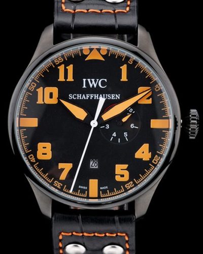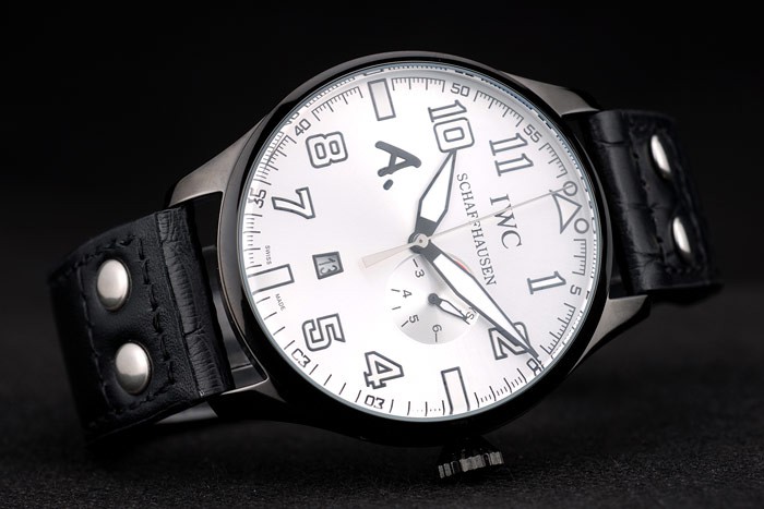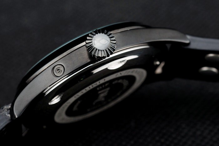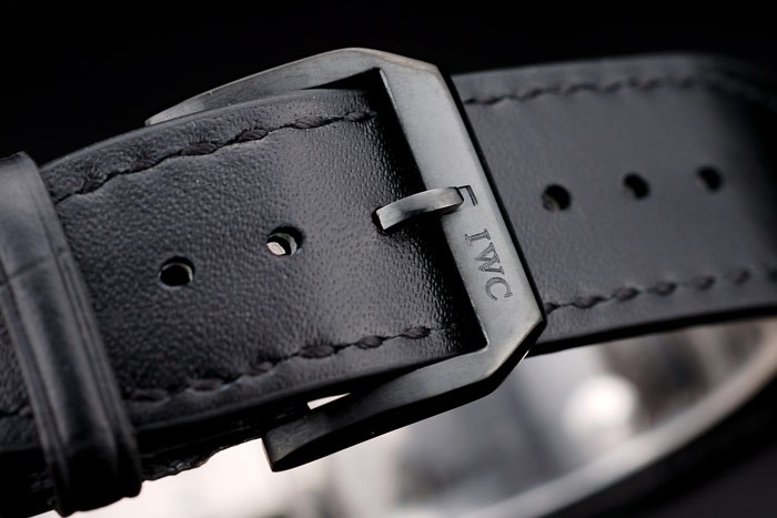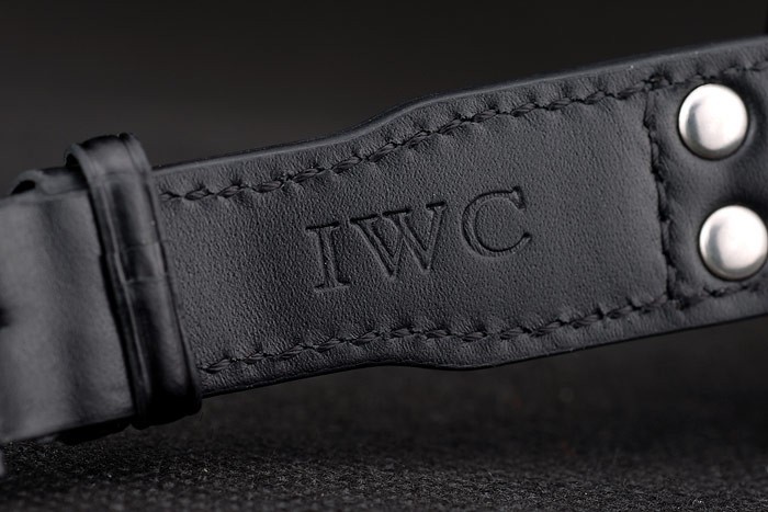 Bracelet: IWC Replica heat embossed black crocodile leather strap with IWC Replica engraved ion-plated stainless steel hook-buckle clasp