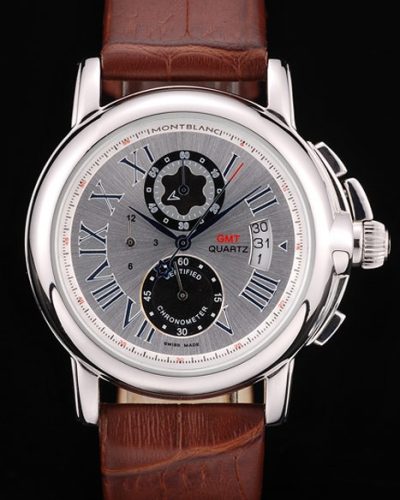 Crown: Ion-plated cutwork crown with MontBlanc Replica logo and two polished stainless steel push button crowns on either side of it
