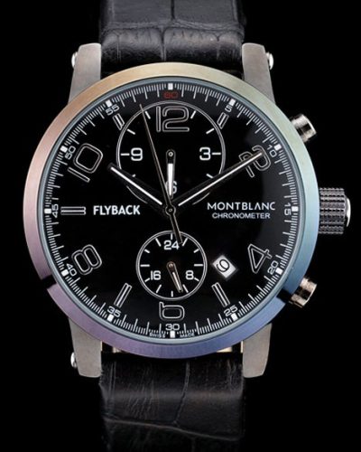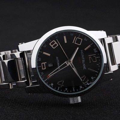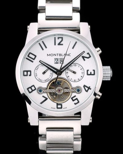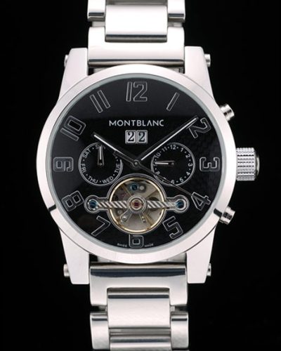 Crown: Polished stainless steel cutwork crown with MontBlanc Replica logo and two polished stainless steel push button crowns on either side of it