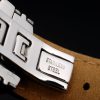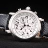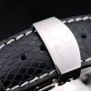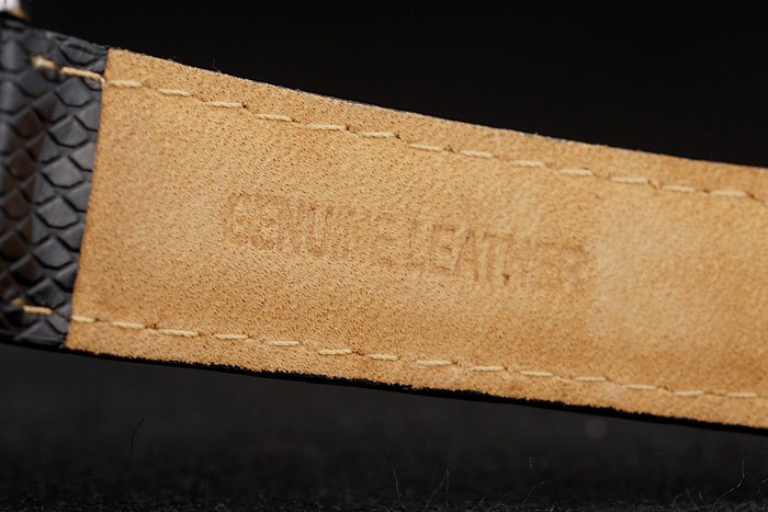 Bracelet: MontBlanc Replica heat embossed black snakeskin leather strap with white thread stitching and polished stainless steel hidden hook clasp