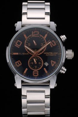 Bracelet: Heat embossed MontBlanc Replica black crocodile leather strap with MontBlanc Replica name and logo engraved polished stainless steel flip-over hook clasp