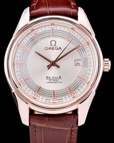 Bracelet: Patent brown snake leather strap with heat embossed Omega Replica stamp and thickly highlighted Omega Replica logo hook-buckle rose-gold clasp