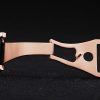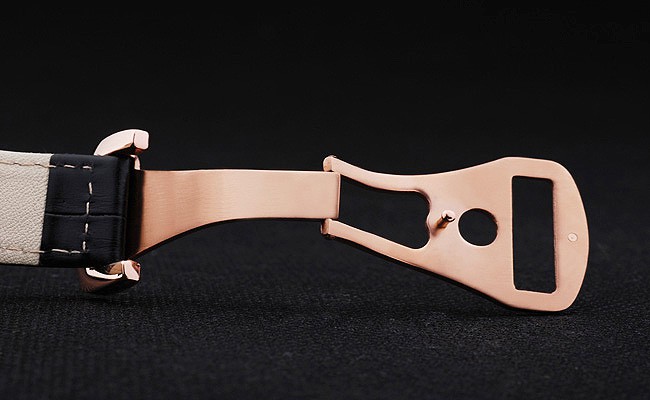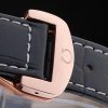 Bracelet: Black crocodile leather strap with white stitching and Omega Replica logo engraved yellow gold hook-buckle clasp