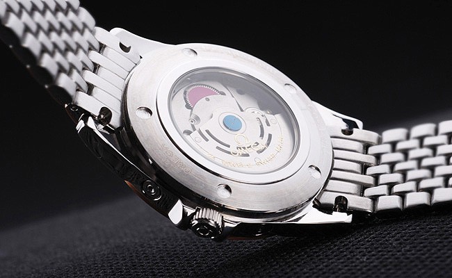 Back: Stainless steel push-in case back with Omega Replica inscriptions and transparent centre that reveals the mechanics within
