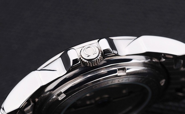 Crown: Polished stainless steel cutwork crown with Omega Replica logo
