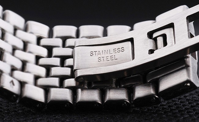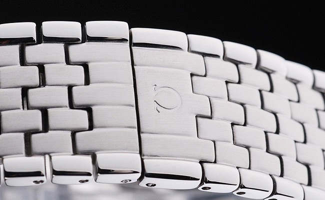 Bracelet: Brushed and polished stainless steel link bracelet with Omega Replica logo engraved hidden clasp